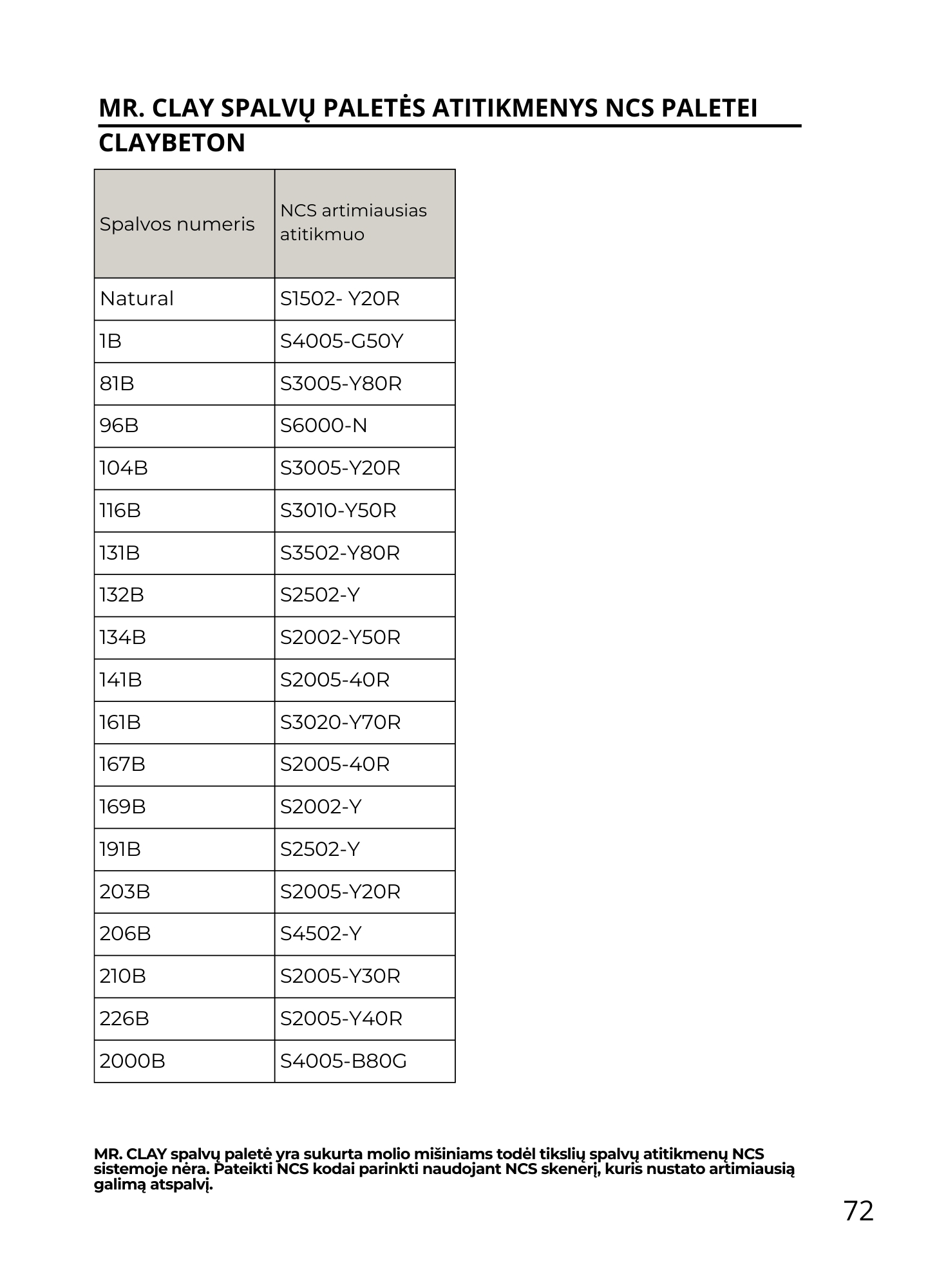If you want to find out the NCS code for clay plaster, please download this file. We scanned all colors with NCS scanners and created tables where you can see the NCS code for the selected clay plaster color. Please note that the color of the clay plaster will not be identical to the NCS code, but only a similar shade.