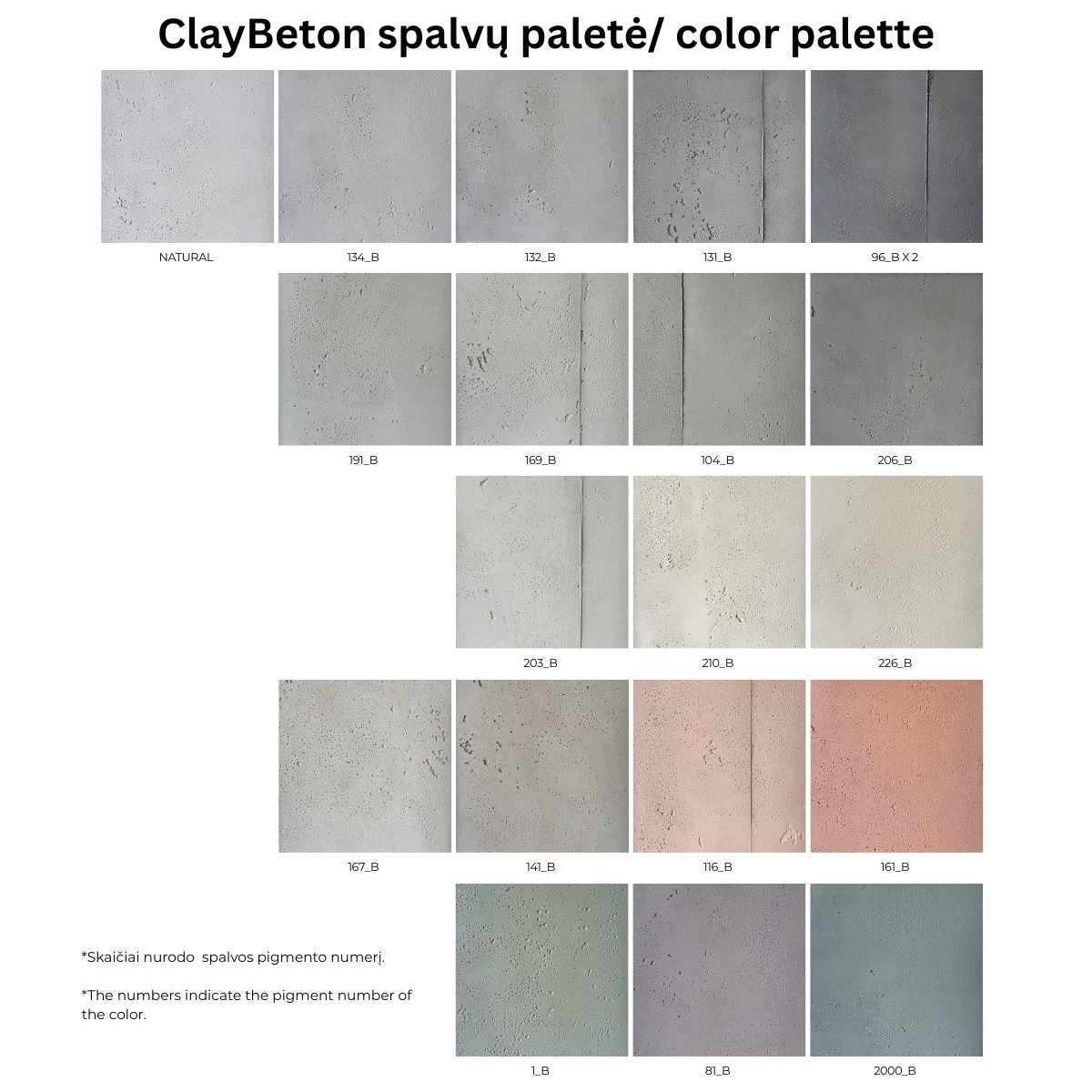 The base mixture is light gray. The sample color palette includes 19 colors, but you can also tint it yourself with any other pigment from more than 100 different MR. CLAY shades, all suitable for use with any mixture.