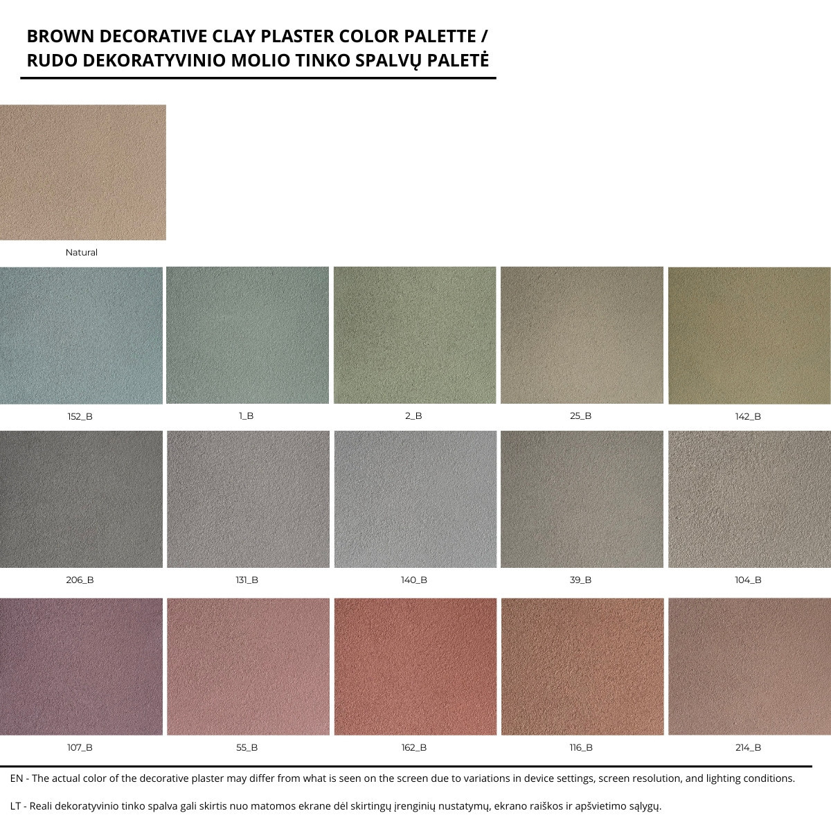 Brown decorative clay plaster is a mineral-based mixture designed for the final interior wall finishing of residential and commercial spaces. The product is natural and vapor-permeable, and it absorbs liquids, therefore it is suitable only for dry indoor areas where it will not come into direct contact with water, dirt, or grease.