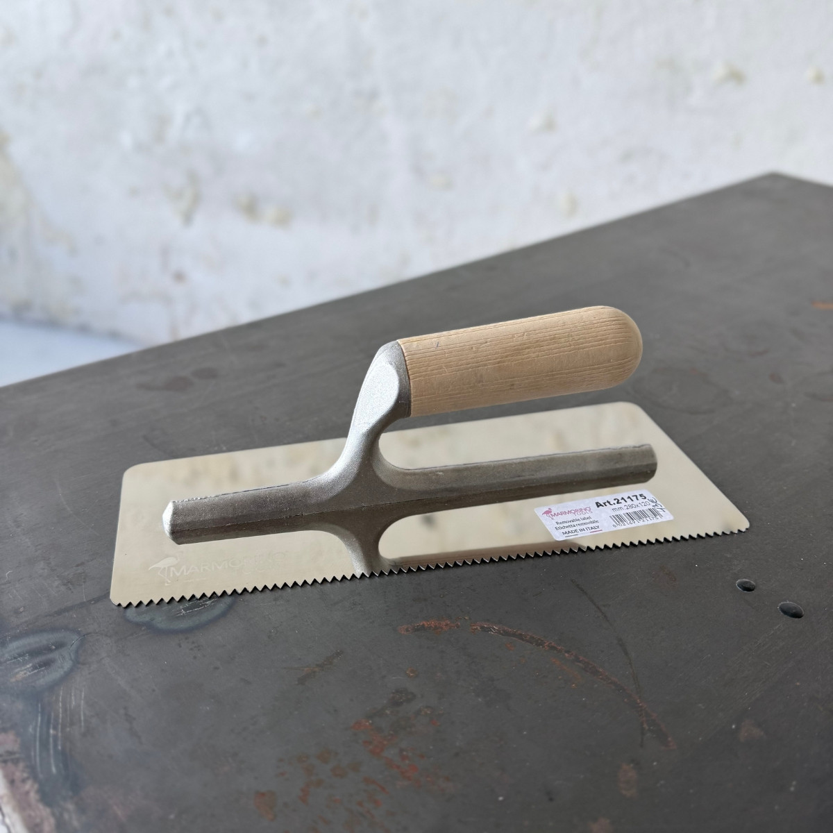 Ypatingai lengva, nerūdijančio plieno glaistyklė dantytu kraštu. Užapvalinti kampai užtikrins, kad įrankis neraižytų sienos, o nerūdijantis plienas nepaliks juodų žymių ant sienos. Trapecijos formos ašmenys lengvai slys per sieną, nes nei viena briauna neturi status kampo. Italų prekės ženklo Marmorino tools įrankis.