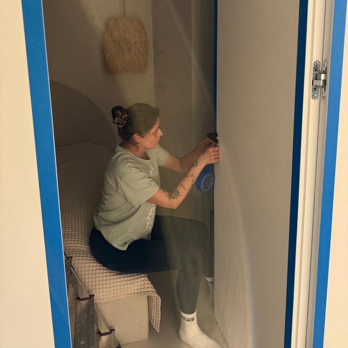 In our 50 m² cottage, we decided to plaster not only the walls but also the hidden doors ourselves.