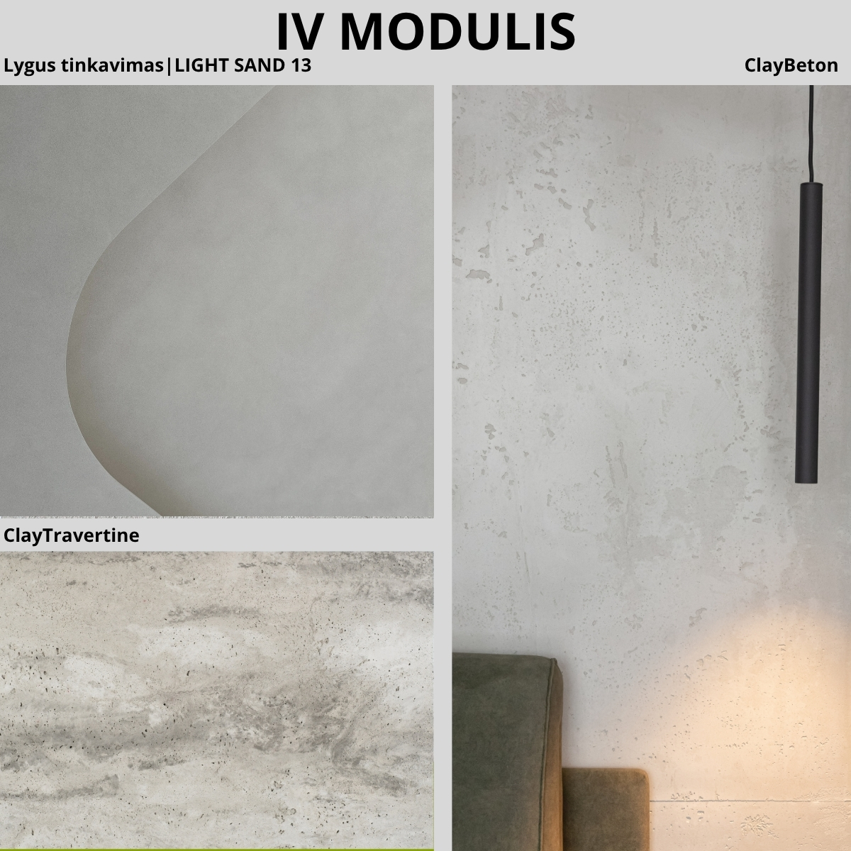 Atliksime 4 dekoratyvines technikas: betono ir travertino akmens imitacijas su ClayBeton dekoratyviniu tinku, vienspalvį tinkavimą, tinkantį visų namų luboms ir sienoms su dekoratyviniu molio tinku "Light sand 13" ir mikrocemento imitaciją su baltu dekoratyviniu molio tinku.