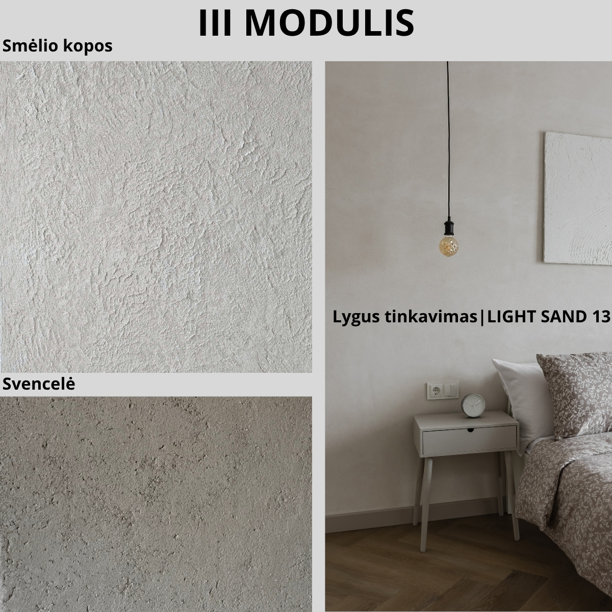 Atliksime 3 dekoratyvines technikas: Bangelių techniką, lygų vienspalvį tinkavimą tinkantį visoms luboms ir sienoms, bei grubesnės faktūros techniką su molio tinku "Svencelė".