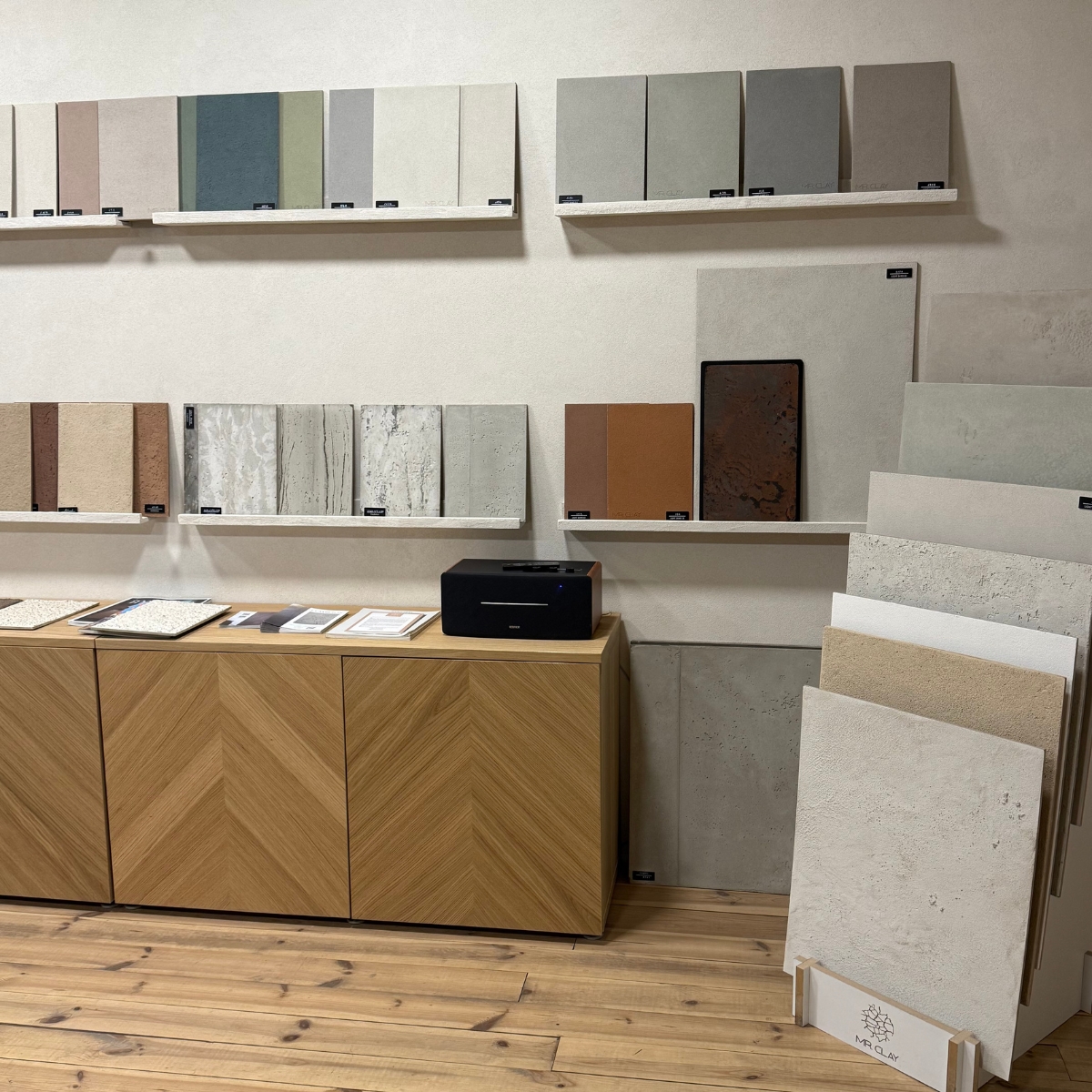 Parduotuvėje galima apžiūrėti pavyzdžius ir įsigyti prekių (dideli kiekiai nesandėliuojami, rekomenduojame molio tinką užsakyti per e-parduotuvę su pristatymu į namus)